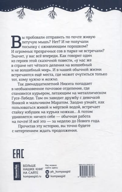Так двенадцатилетний Никита попадает в необыкновенное почтовое отделение, где становится курьером, летающим на металлическом Гусе-Лебеде. Там он заводит дружбу с девочкой Яникой и мальчиком Маратом. Заодно узнаёт, как пользоваться живой и мёртвой водой, встречает стайку избушек на курьих ножках… А потом удивляется: ничего себе — обычная работа на почте! И всё это — за неделю до Нового года.