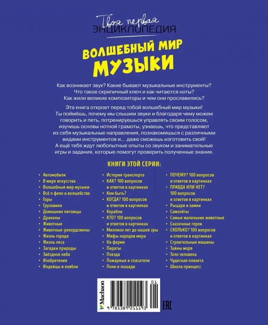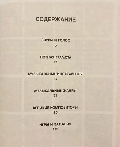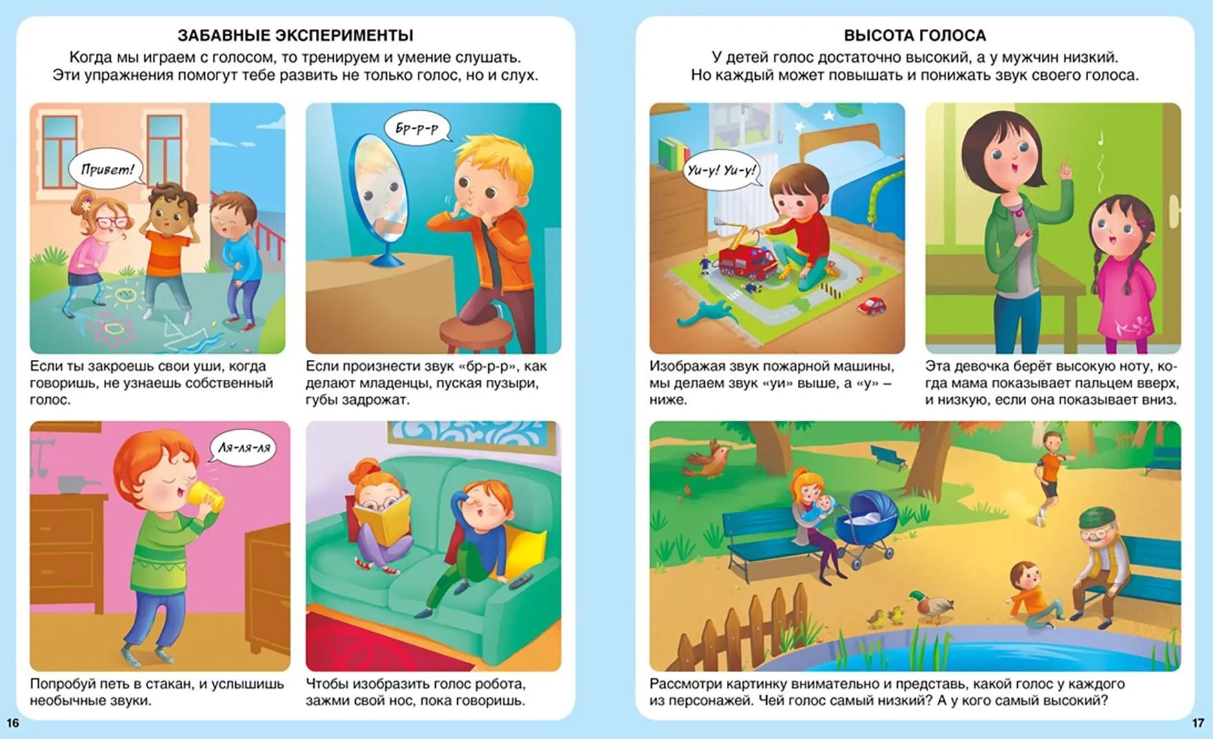 Ты поймёшь, почему мы слышим звуки и благодаря чему можем говорить и петь, потренируешься управлять своим голосом, изучишь основы нотной грамоты, узнаешь, что представляют из себя музыкальные направления, познакомишься с различными видами инструментов и… даже сможешь изготовить свой! А ещё тебя ждут любопытные опыты со звуком и занимательные игры и задания, которые помогут проверить полученные знания.