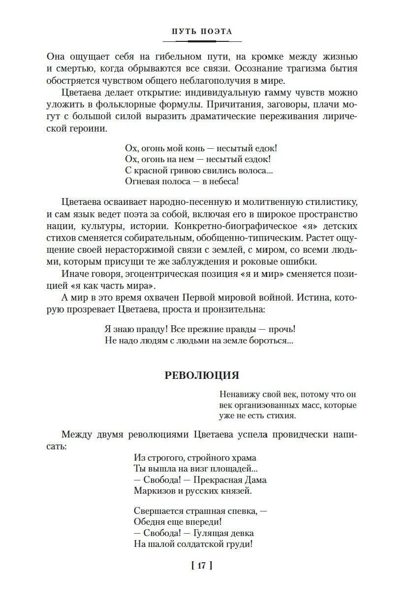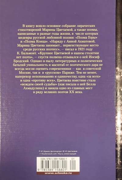 В книгу вошло основное собрание лирических стихотворений Марины Цветаевой, а также поэмы, написанные в разные годы жизни, в числе которых шедевры русской любовной поэзии: «Поэма Горы» и «Поэма Конца». «Наряду с Анной Ахматовой, Марина Цветаева занимает… первенствующее место среди русских поэтесс», — писал в 1921 году К. Бальмонт. «Крупнее Цветаевой в нашем столетии нет поэта», – спустя полвека отзывался о ней Иосиф Бродский. Однако в пылу литературных и политических баталий уникальность и масштаб ее поэтического дара не всегда могли оценить современники – как в советской Москве, так и в «русском» Париже. Тем не менее, наперекор непониманию и одиночеству, одна «за всех» и одна «противу всех», Цветаева поистине стала «вождем своей судьбы» (как писала о ней Белла Ахмадулина) и заняла одно из главных мест в ряду великих поэтов ХХ века.