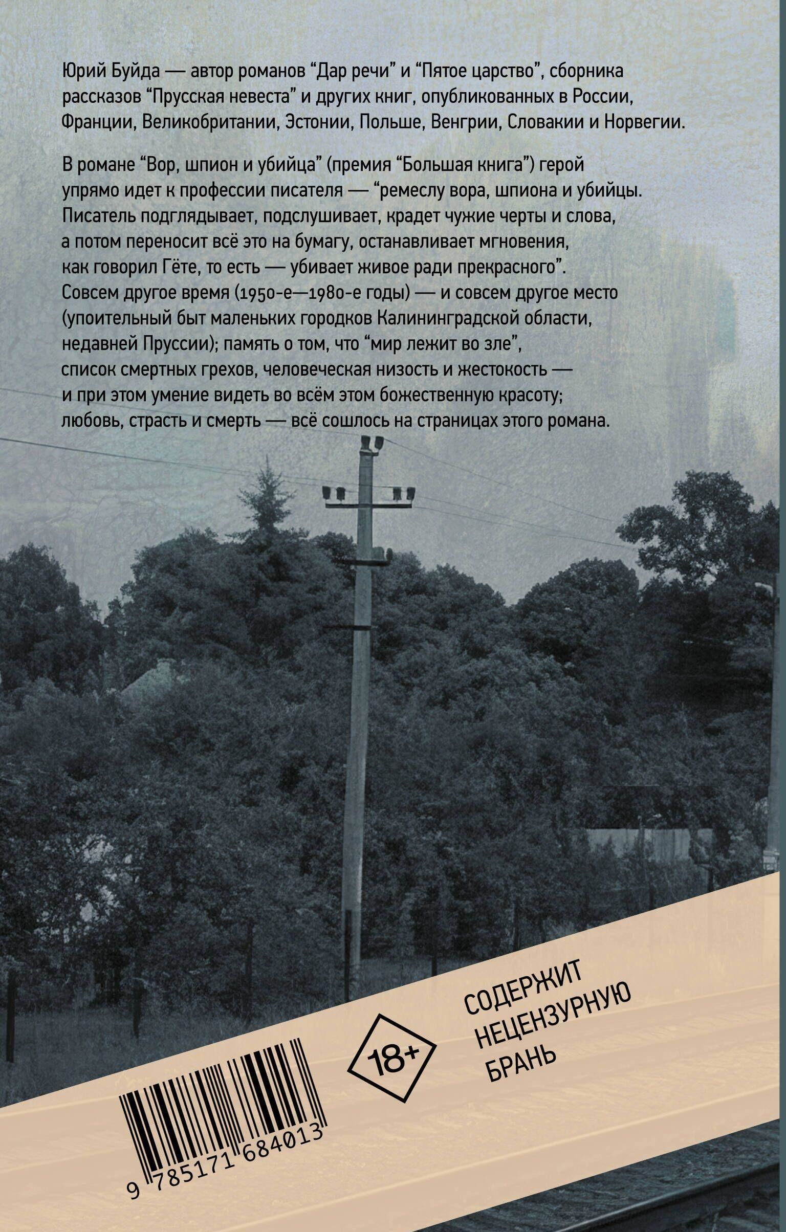В романе «Вор, шпион и убийца» (премия «Большая книга») герой упрямо идет к профессии писателя — «ремеслу вора, шпиона и убийцы. Писатель подглядывает, подслушивает, крадет чужие черты и слова, а потом переносит всё это на бумагу, останавливает мгновения, как говорил Гёте, то есть — убивает живое ради прекрасного…».