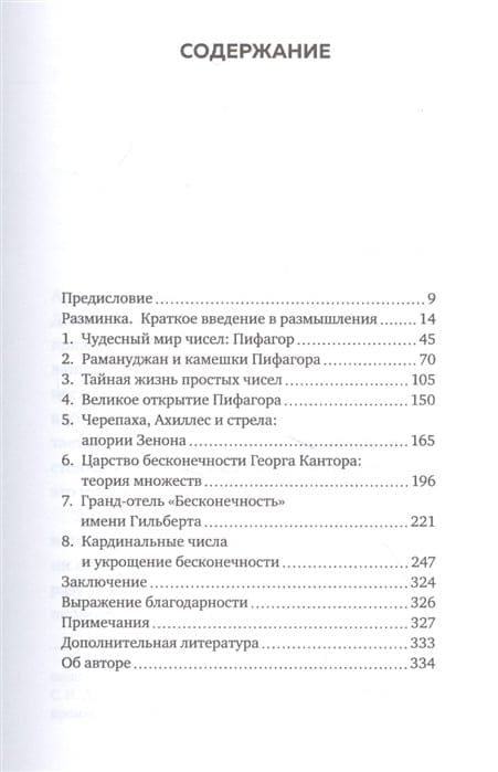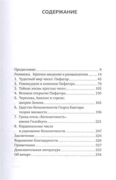 Математические формулы — такое же чудо, как и гениальные произведения великих композиторов и писателей, утверждает автор нескольких бестселлеров, математик и философ Хаим Шапира. Всем, кто желает расширить свой кругозор, он предлагает познакомиться с математическими теориями, касающимися самой красивой из концепций, когда-либо созданных человечеством, — концепцией бесконечности. Эта концепция волновала многих выдающихся мыслителей, среди которых Зенон и Пифагор, Георг Кантор и Бертран Рассел, Софья Ковалевская и Эмми Нётер, аль-Хорезми и Евклид, Софи Жермен и Сриниваса Рамануджан. Поскольку мир бесконечности полон парадоксов, немало их и в этой книге: апории Зенона, гильбертовский отель "Бесконечность", парадокс Ахиллеса и богов, парадокс Рая и Ада, парадокс Росса — Литлвуда о теннисных мячах, парадокс Галилея и многие другие.