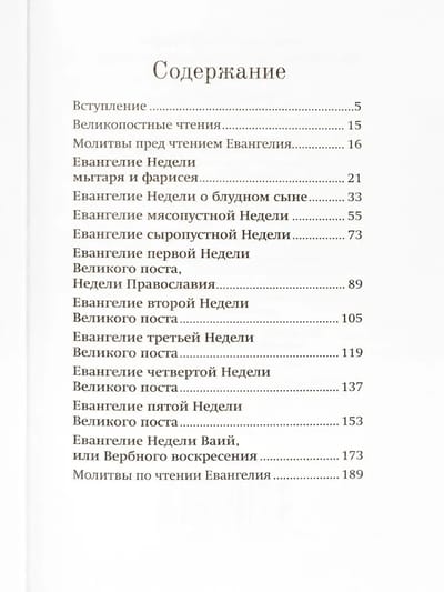 В данном издании приводятся краткие и общедоступные толкования евангельских чтений, которые произносятся в воскресные дни Великого поста, а также на четырех Неделях, предшествующих Великому посту. Сначала приводится само евангельское чтение данного воскресного дня на церковнославянском и русском языках, затем, если в нем есть места, требующие разъяснения, они растолковываются, наконец, из чтения выводятся поучительные наставления для нашей жизни и деятельности.
