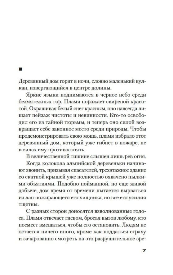 Деревянный дом горит в ночи, словно маленький вулкан, извергающийся в центре долины. Яркие языки поднимаются в черное небо среди безмятежных гор... И в одно мгновение все рушится.