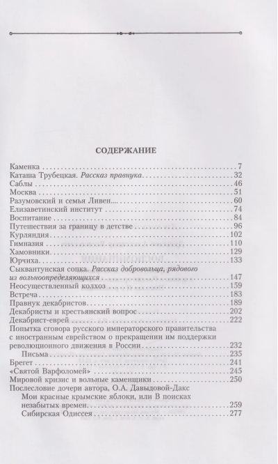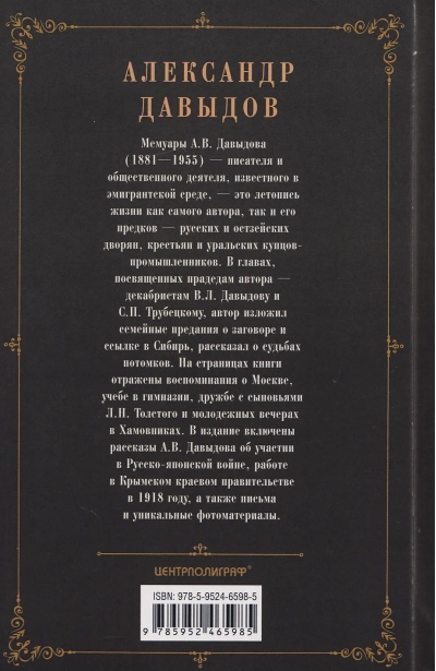 Мемуары А.В. Давыдова (1881—1955) — писателя и общественного деятеля, известного в эмигрантской среде, — это летопись жизни как самого автора, так и его предков — русских и остзейских дворян, крестьян и уральских купцов-промышленников. В главах, посвященных прадедам автора — декабристам В.Л. Давыдову и С.П. Трубецкому, автор изложил семейные предания о заговоре и ссылке в Сибирь, рассказал о судьбах потомков. На страницах книги отражены воспоминания о Москве, учебе в гимназии, дружбе с сыновьями Л.Н. Толстого и молодежных вечерах в Хамовниках. В издание включены рассказы А.В. Давыдова об участии в Русско-японской войне, работе в Крымском краевом правительстве в 1918 году, а также письма и уникальные фотоматериалы.