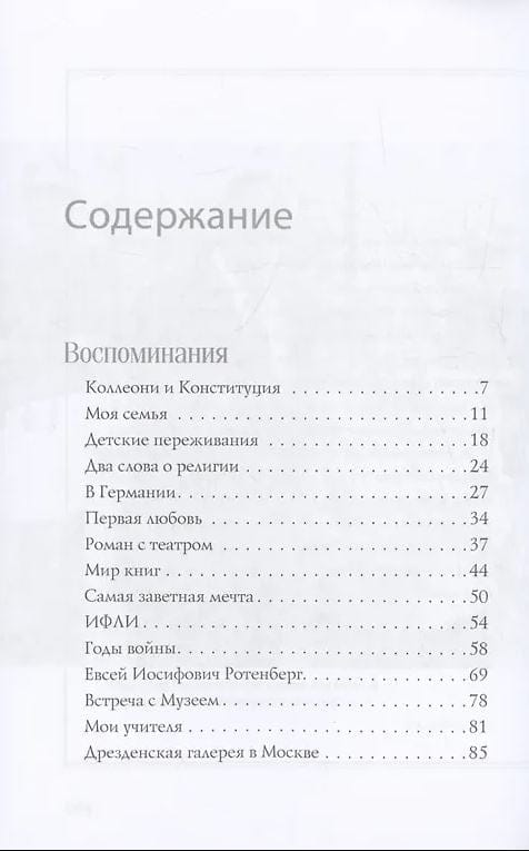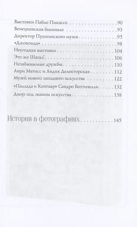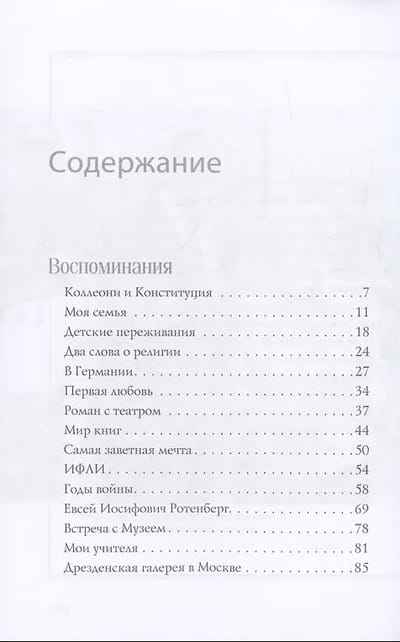 В своей книге она рассказывает о детстве, юности, военных годах, встречах с известными людьми (а среди них Марк Шагал, Илья Эренбург, супруга А. Матисса Лидия Делекторская) и о служении великому искусству. Книгу органично дополняют фотографии, отражающие не только события жизни автора, но и культурной истории страны за последние шестьдесят лет.