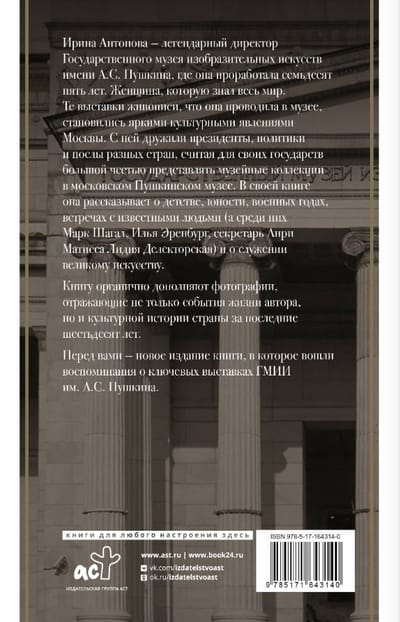 Ирина Антонова — легендарный директор Государственного музея изобразительных искусств имени А.С. Пушкина, где она проработала семьдесят пять лет. Женщина, которую знал весь мир. Те выставки живописи, что она проводила в Музее, становились яркими культурными явлениями Москвы. С ней дружили президенты, политики и послы разных стран, считая для своих государств большой честью представлять музейные коллекции в московском Пушкинском музее.