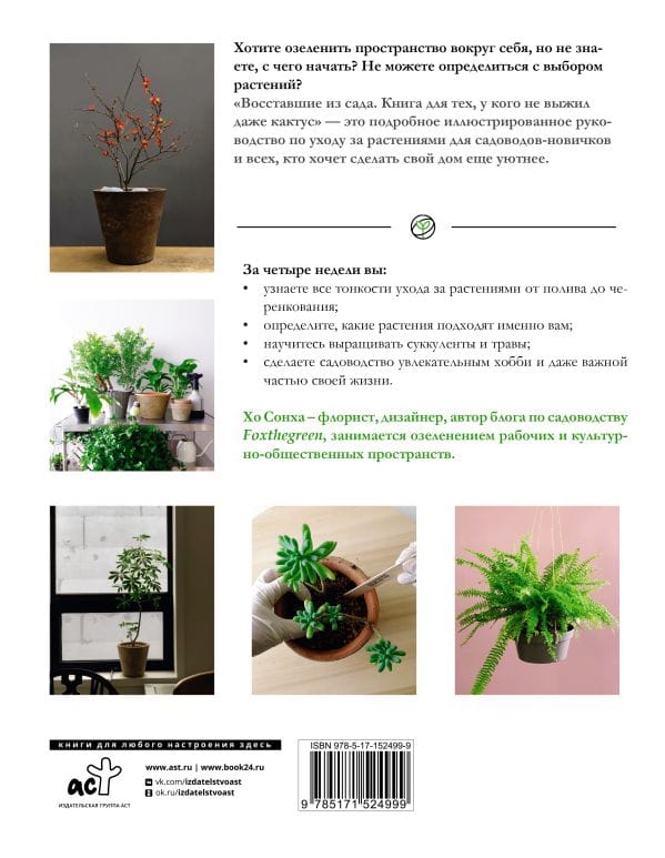 Хо Сонха – флорист из Сеула, дизайнер, автор блога по садоводству Foxthegreen, занимается озеленением рабочих и культурно-общественных пространств. «Восставшие из сада» - это книга не только для тех, у кого не выжил даже кактус, но и для опытных садоводов, которые хотят совершенствоваться в постижении растительных премудростей. В книге представлен авторский четырехнедельный курс по выращиванию растений, трав и суккулентов. Автор освещает все самые важные аспекты ухода за комнатными растениями: способы пересадки растений, условия полива и содержания, удобрения, особенности выращивания трав и многие другие значимые вопросы. От азов домашнего садоводства до искусных технологий выращивания капризной флоры - эта богато иллюстрированная настольная книга для всех любителей растений скрасит будни и поможет найти новое хобби.