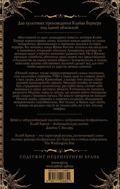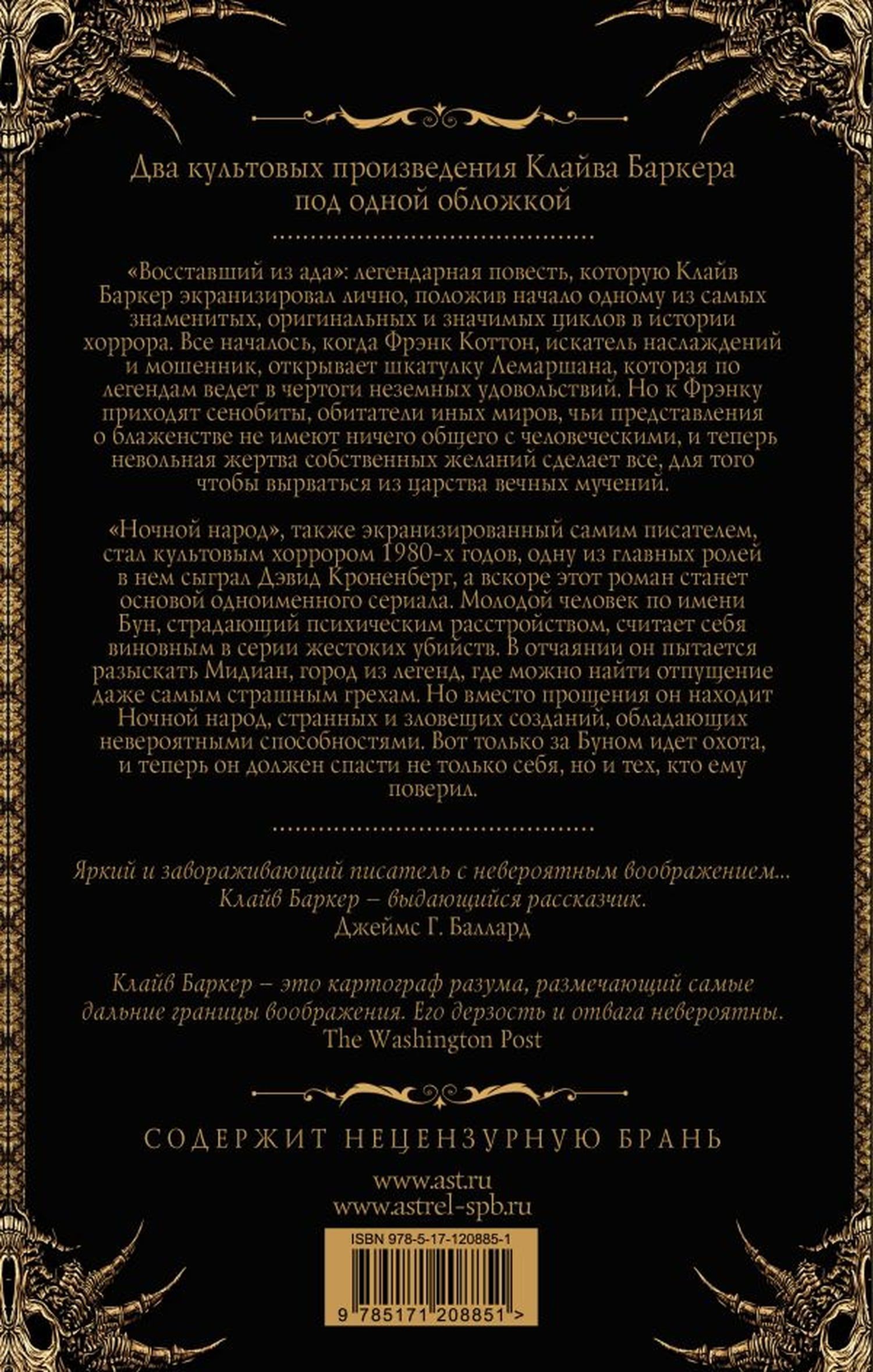«Восставший из ада»: легендарная повесть, которую Клайв Баркер экранизировал лично, положив начало одному из самых знаменитых, оригинальных и значимых циклов в истории хоррора. Все началось, когда Фрэнк Кот тон, искатель наслаждений и мошенник, открывает шкатулку Лемаршана, которая по легендам ведет в чертоги неземных удовольствий. Но к Фрэнку приходят сенобиты, обитатели иных миров, чьи представления о блаженстве не имеют ничего общего с человеческими, и теперь невольная жертва собственных желаний сделает все для того, чтобы вырваться из царства вечных мучений.