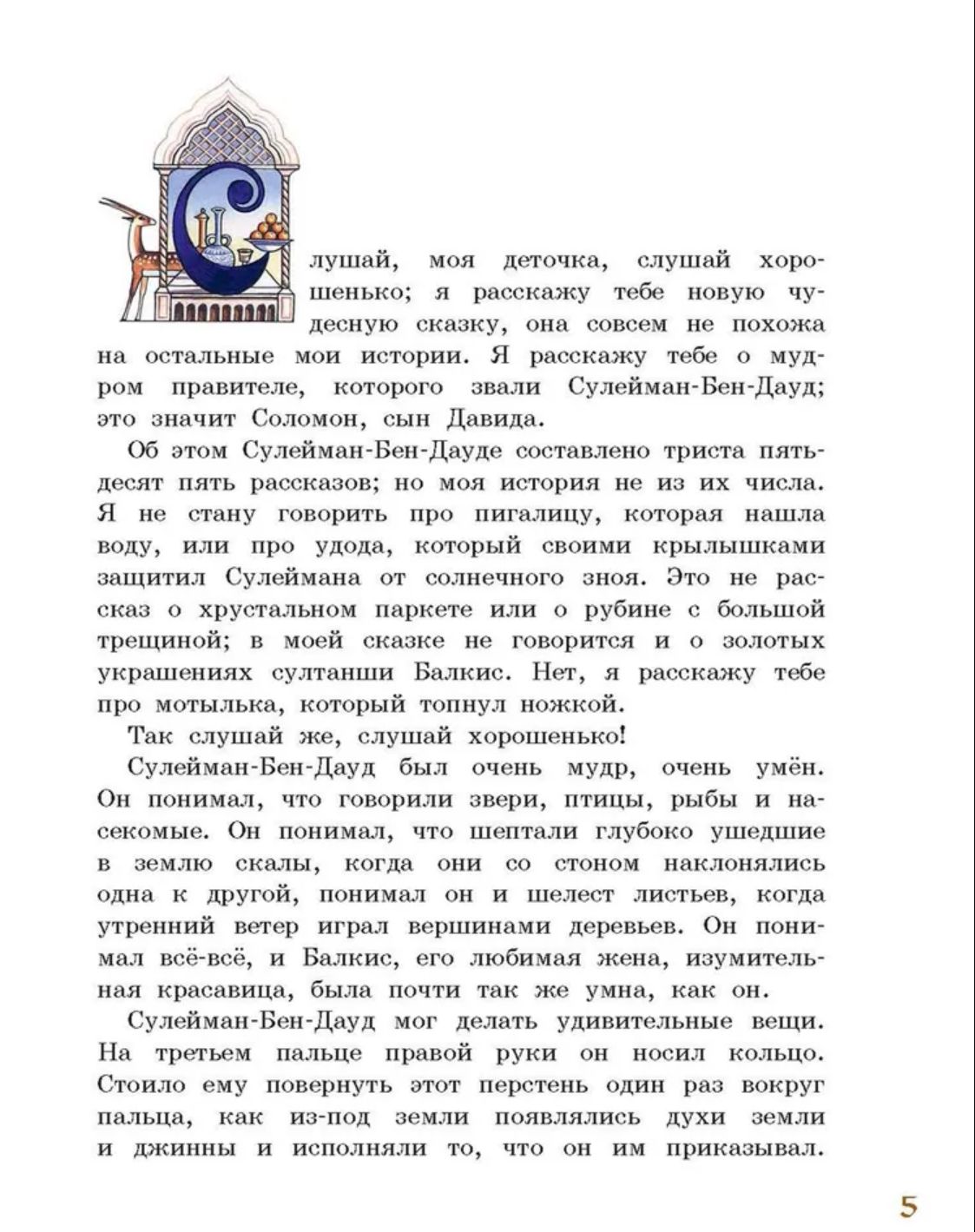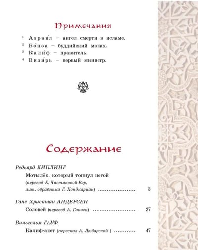 В сборник вошли авторские сказки известных европейских писателей, вдохновленных мудростью Востока: «Мотылёк, который топнул ногой» Редьярда Киплинга, «Соловей» Ганса Христиана Андерсена и «Калиф-аист» Вильгельма Гауфа. Юных читателей ждет встреча с халифами и визирями, принцессами и волшебниками, говорящими зверями и диковинными птицами. Филигранные по прорисовке иллюстрации Аси Любимовой делают книгу похожей на восточный ковер ручной работы.