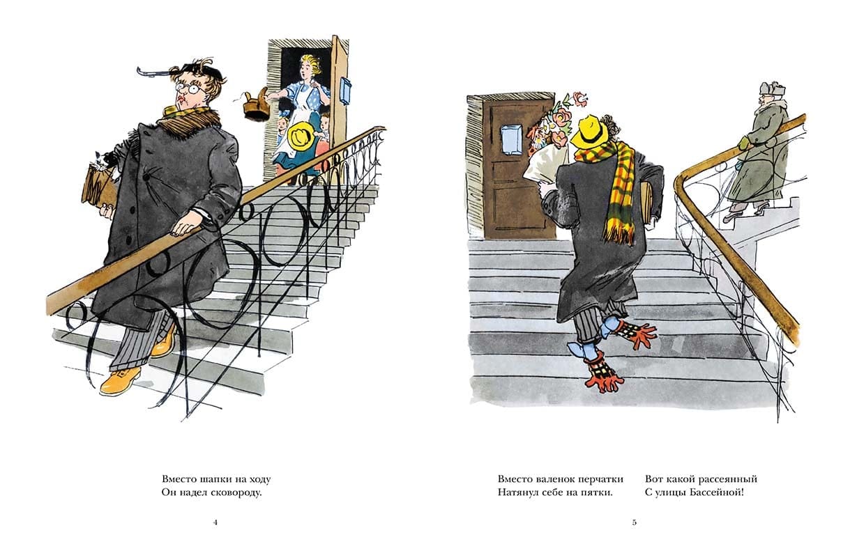История в стихах «Вот какой рассеянный» увидела свет в 1930 году. По количеству переизданий это самое популярное произведение Самуила Маршака. Выражение «рассеянный с Бассейной» сразу стало крылатым и остается таковым до сих пор, хотя Бассейной улицы уже давно нет в Санк-Петербурге (ее переименовали в улицу Некрасова). Прототипом главного персонажа был советский физикохимик И. А. Каблуков, который славился своей непрактичностью и рассеянностью. Но некоторые современники Маршака видели в «рассеянном» черты самого автора. Сюжет книги хорошо известен: рассеянный человек с ленинградской улицы Бассейной надевает на себя совершенно неподходящие вещи, затем едет на вокзал и двое суток сидит в отцепленном вагоне, полагая, что поезд везет его в Москву. В отличие от других героев Маршака, которые строгают, пилят, разносят почту, тушат пожары, этот не приставлен ни к какому делу. Образ «рассеянного» скорее сатирический, но благодаря иллюстрациям Аминадава Каневского он выглядит милым и обаятельным чудаком. К тому же его «рассеянный» герой очень похож на автора – именно так выглядел Маршак в тридцатые годы прошлого века; именно с таким портфелем, набитым рукописями, он ходил на работу. Познавательная ценность книги несомненна. Преднамеренное искажение действий героя, «перевертыш» веселят маленького читателя. Ведь у него уже есть скромный житейский опыт, и он знает, что сковорода – не одежда, а перчатки на ноги не надевают. По сути «Рассеянный с улицы Бассейной» закрепляет у ребенка правильное представление о норме, учит собранности, спокойствию, рассудительности, иначе можно совершить сотню глупых поступков. А еще важно прислушиваться к окружающим, иногда можно и посоветоваться с кем-то. Ведь главному герою отвечали на его вопросы, но он слышал только себя. Рекомендуется для чтения взрослыми детям. «Формула «рассеянный с улицы Бассейной» зажила своей, отдельной от маршаковского стихотворения жизнью, вошла в речь разных общественных слоев, в сознание многих поколений, стала частью русского языка. А нелепые выходки чудаковатого героя продолжают радовать нынешних детей, как они радовали своих первых читателей – детей 1930 года. Иные литературные герои той поры – в автомобилях, в поездах и на самолетах – так и не смогли выбраться за пределы своей эпохи, а «рассеянный» Маршака в своем отцепленном вагоне добрался до нашего времени и благополучно катит дальше.