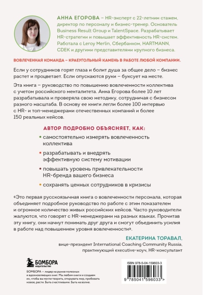 Эта книга — руководство по повышению вовлеченности коллектива. Автор, HR-эксперт Анна Егорова, более 10 лет разрабатывала и проверяла свою методику, сотрудничая с бизнесом разного масштаба. В основу ее книги легло более 100 интервью с HR- и топ-менеджерами отечественных компаний и более 150 реальных кейсов.