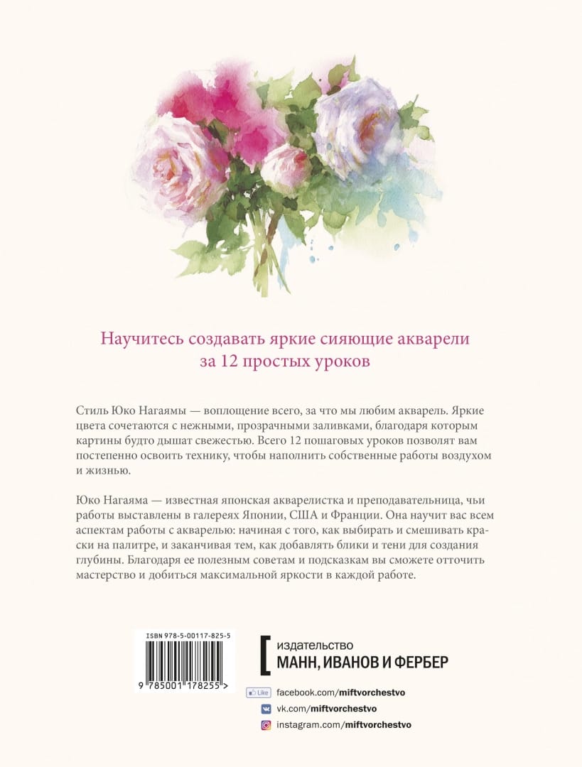 Неважно, новичок вы или опытный художник, книга популярной японской художницы Юко Нагаямы станет для вас руководством по удивительным и зачастую сложным акварельным техникам. За 12 простых уроков вы научитесь создавать яркие работы. В основе — уникальный и успешный авторский подход к созданию красочных акварелей. Здесь есть пошаговые иллюстрации и подробные инструкции, благодаря которым обучение технике акварели будет простым и понятным для начинающих художников. Книга станет бесценным источником знаний для художников более опытных, а также для тех, кто решит освежить свои навыки. Нагаяма касается всех основных тем: начиная с того, как смешивать краску на палитре, и заканчивая тем, как добавлять блики и тени для создания глубины. В дополнение к акварельным краскам автор использует золотую и платиновую, а также краски, характерные для традиционной японской живописи. Многочисленные полезные советы и подсказки делают книгу Нагаямы идеальным пособием для художников любого уровня.