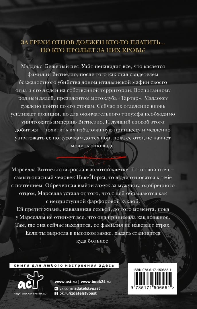 Мэддокс Бешеный пес Уайт ненавидит все, что касается фамилии Витиелло, после того, как стал свидетелем безжалостного убийства доном итальянской мафии своего отца и его людей на собственной территории. Воспитанному родным дядей, президентом мотоклуба «Тартар», Мэддоксу суждено пойти по его стопам. Сейчас их отделение вновь усиливает позиции, но для окончательного триумфа необходимо уничтожить империю Витиелло. И лучший способ этого добиться — похитить их избалованную принцессу и медленно уничтожать ее по кусочкам до тех пор, пока ее отец не начнет молить о пощаде. Марселла Витиелло, выросла в «золотой клетке». Если твой отец — самый опасный человек Нью-Йорка, то люди относятся к тебе с почтением. Обреченная выйти замуж за мужчину, одобренного отцом, Марселла устала от того, что с ней обращаются, как с неприступной фарфоровой куклой. Ей претит жизнь, навязанная семьей, до того момента, пока у Марселлы не отнимут все, что она принимала как должное. Там, где она сейчас находится, ее фамилия не навевает страх. Если ты выросла в высоком замке, падать становится куда больнее.