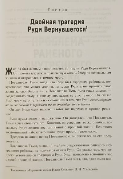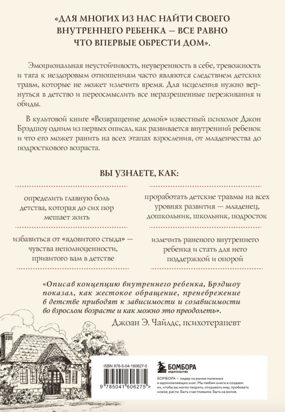 Джон Брэдшоу, известный американский психолог, один из первых, кто объяснил значение неразрешенных детских переживаний и последствий детской травмы. В своей книге автор представляет уникальную авторскую методику — проработку травматического опыта на всех уровнях развития раненого внутреннего ребенка — младенец, дошкольник, школьник, подросток.