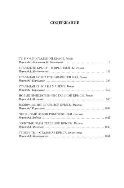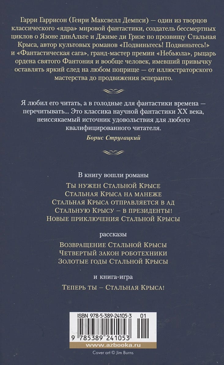 Цикл Гарри Гаррисона о Джиме ди Гризе, прозванном Стальной Крысой, по праву считается одним из лучших в творчестве прославленного фантаста. Герой цикла, великий плут и мошенник, умеет выходить сухим из воды практически в любой ситуации, какой бы безнадежной она ни показалась вначале, — и в любом уголке Вселенной, куда бы его ни забрасывала судьба. В безумной ли борьбе за президентское кресло, связанной со смертельным риском, на планете Параисо-Аки. Или в глубинах ада, куда Джим отправляется ради спасения любимой супруги. Ну а уж когда богатейший в Галактике человек предлагает фантастическое по сумме вознаграждение за некое опасное дело, тут уж сам Творец мира не уговорит его отказаться. Но, даже разбогатев и получив редкую для себя возможность уединиться вместе с семейством, Джим ди Гриз недолго пребывает в покое. Ведь он не кто-нибудь, а Стальная Крыса, человек из нержавеющей стали.