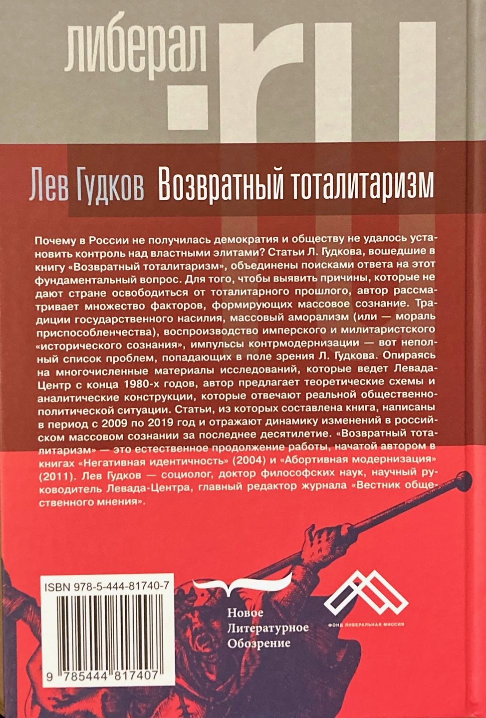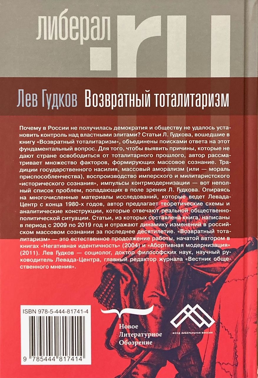 Почему в России не получилась демократия и обществу не удалось установить контроль над властными элитами? Статьи Л. Гудкова, вошедшие в книгу «Возвратный тоталитаризм», объединены поисками ответа на этот фундаментальный вопрос. Для того, чтобы выявить причины, которые не дают стране освободиться от тоталитарного прошлого, автор рассматривает множество факторов, формирующих массовое сознание. Традиции государственного насилия, массовый аморализм (или - мораль приспособленчества), воспроизводство имперского и милитаристского «исторического сознания», импульсы контрмодернизации - вот неполный список проблем, попадающих в поле зрения Л. Гудкова. Опираясь на многочисленные материалы исследований, которые ведет Левада-Центр с конца 1980-х годов, автор предлагает теоретические схемы и аналитические конструкции, которые отвечают реальной общественно-политической ситуации. Статьи, из которых составлена книга, написаны в период с 2009 по 2019 год и отражают динамику изменений в российском массовом сознании за последнее десятилетие. «Возвратный тоталитаризм» - это естественное продолжение работы, начатой автором в книгах «Негативная идентичность» (2004) и «Абортивная модернизация» (2011). Лев Гудков - социолог, доктор философских наук, научный руководитель Левада-Центра, главный редактор журнала «Вестник общественного мнения».
