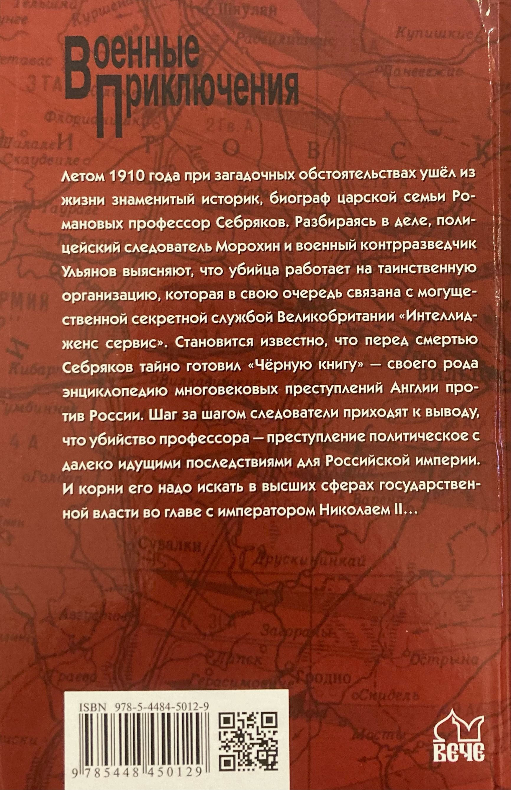 Летом 1910 года при загадочных обстоятельствах ушёл из жизни знаменитый историк, биограф царской семьи Романовых профессор Себряков. Разбираясь в деле, полицейский следователь Морохин и военный контрразведчик Ульянов выясняют, что убийца работает на таинственную организацию, которая, в свою очередь, связана с могущественной секретной службой Великобритании «Интеллидженс сервис». Становится известно, что перед смертью Себряков тайно готовил «Чёрную книгу» — своего рода энциклопедию многовековых преступлений Англии против России. Шаг за шагом следователи приходят к выводу, что убийство профессора — преступление политическое с далеко идущими последствиями для Российской империи. И корни его надо искать в высших сферах государственной власти во главе с императором Николаем II...