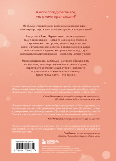 Автор книги Анна Черных много лет исследовала тему празднования — когда-то именно оно спасло ее от хронического выгорания, вечного недовольства собой и душевного одиночества. В своей книге она щедро делится опытом и идеями, которые помогут выдохнуть скопившееся внутри напряжение — и просиять на тысячу огней!