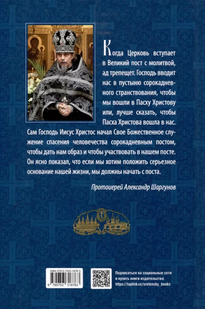 Книга «Время Великого поста» для ее автора, протоиерея Александра Шаргунова, — «сорок сороков», сорок Четыредесятниц: в течение сорока лет он служит и проповедует в московских храмах.