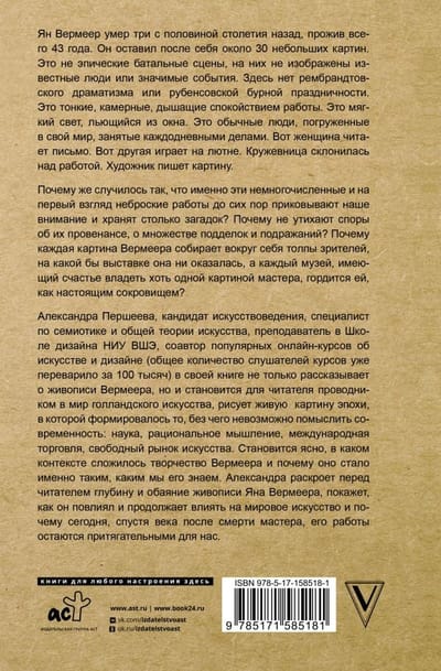 Ян Вермеер умер три с половиной столетия назад, прожив всего 43 года. Он оставил после себя около 30 небольших картин. Это не эпипческие батальные сцены, на них не изображены известные люди или значимые события. Здесь нет рембрандтовского драматизма или рубенсовской бурной праздничности. Это тонкие, камерные, дышащие спокойствием работы. Это мягкий свет, льющийся из окна. Это обычные людим, погруженные в свой мир, занятые каждодневными делами. Вот женщина читает письмо. Вот другая играет на лютне. Кружевница склонилась над работой. Художник пишет картину.Почему же случилось так, что именно эти немногочисленные и на первый взгляд неброские работы до сих пор приковывают наше внимание и хранят столько загадок? Почему не утихают споры об их провенансе, о множестве подделок и подражаний? Почему каждая картина Вермеера собирает вокруг себя толпы зрителей, на какой бы выставке она ни оказалась, а каждый музей, имеющий счастье владеть хоть одной картиной мастера, гордится ей, как настоящим сокровищем?Александра Першеева, кандидат искусствоведения, специалист по семиотике и общей теории искусства, преподаватель в Школе дизайна НИУ ВШЭ, соавтор популярных онлайн-курсом об искусстве и дизайне (общее количество слушателей курсов уже переварило за 100 тысяч) в своей книге не только рассказывает о живописе Вермеера, но и становится для читателя проводником в мир голландского искусства, рисует живую картину эпохи, в которой сформировалось то, без чего невозможно помыслить современность: наука, рациональное мышление, международная торговля, свчободный рынок искусства. Становится ясно, в каком контексте сложилось творчество Вермеера и почему оно стало именно таким, каким мы его знаем. Александра раскроет перед читателем глубину и обаяние живописи Яна Вермеера, покажет, как он повлиял и продолжает влиять на мировое искусство и почему сегодня, спустя века после смерти мастера, его работы остаются притягаительными для нас.