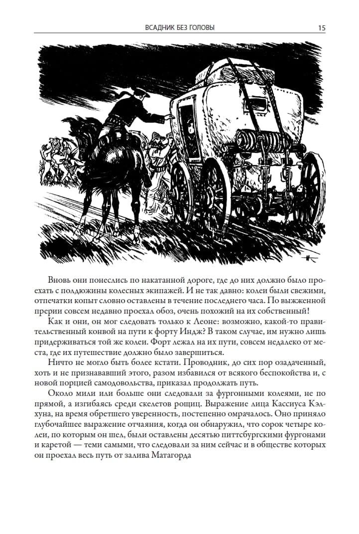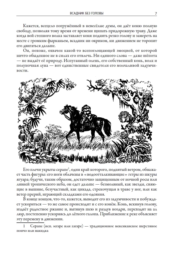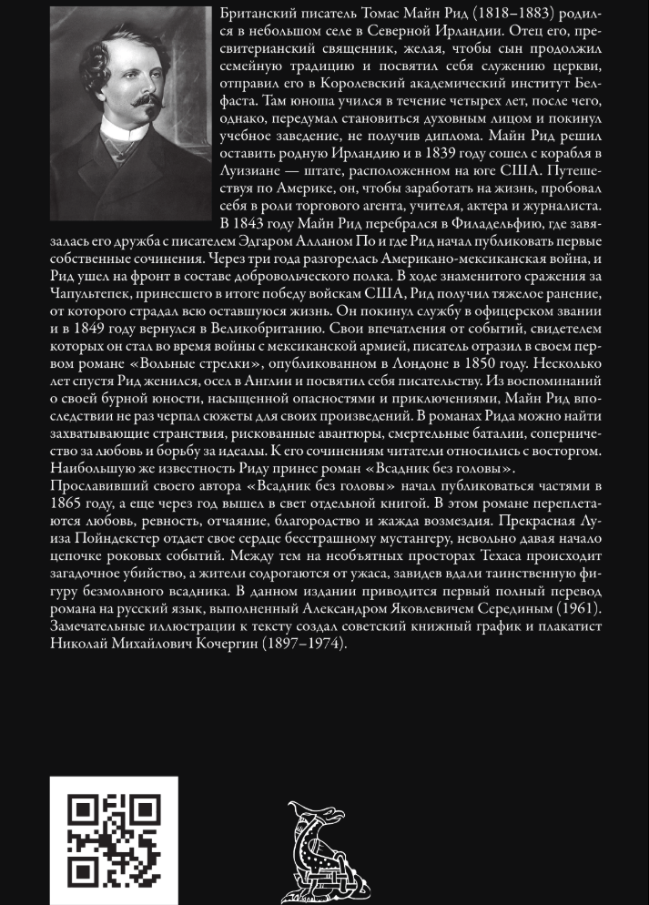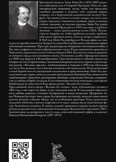Прославивший своего автора «Всадник без головы» начал публиковаться частями в 1865 году, а еще через год вышел в свет отдельной книгой. В этом романе переплетаются любовь, ревность, отчаяние, благородство и жажда возмездия. Прекрасная Луиза Пойндекстер отдает свое сердце бесстрашному мустангеру, невольно давая начало цепочке роковых событий. Между тем на необъятных просторах Техаса происходит загадочное убийство, а жители содрогаются от ужаса, завидев вдали таинственную фигуру безмолвного всадника. В данном издании приводится первый полный перевод романа на русский язык, выполненный Александром Яковлевичем Серединым (1961). Замечательные иллюстрации к тексту создал советский книжный график и плакатист Николай Михайлович Кочергин (1897–1974).