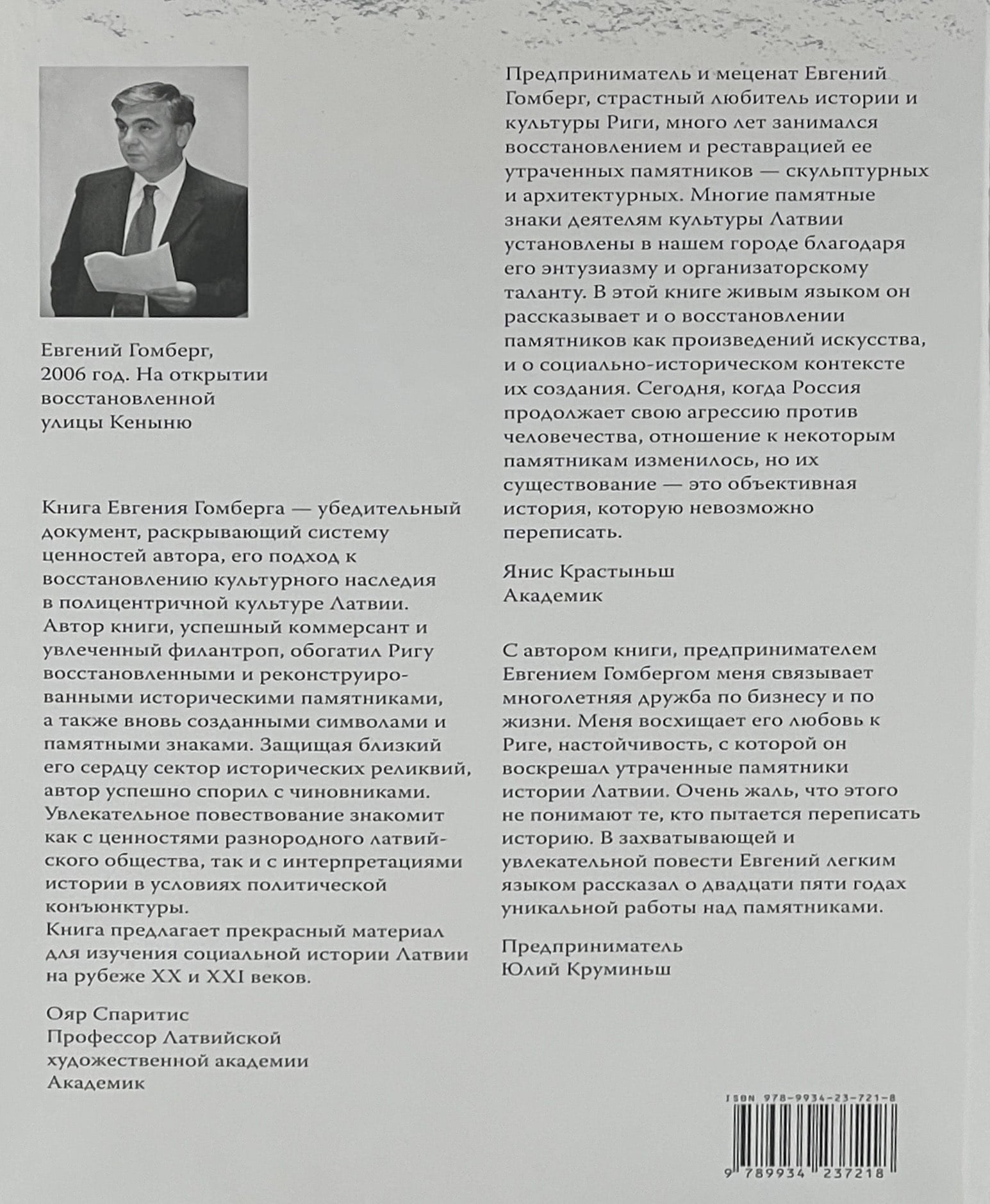 «С автором книги, предпринимателем Евгением Гомбергом меня связывает многолетняя дружба по бизнесу и по жизни. Меня восхищает его любовь к Риге, настойчивость, с которой он воскрешал утраченные памятники истории Латвии. Очень жаль, что этого не понимаю те, кто пытается переписать историю. В захватывающей и увлекательной повести Евгений легким языком рассказал о двадцати пяти годах уникальной работы над памятниками».