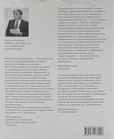 «Предприниматель и меценат Евгений Гомберг, страстный любитель истории и культуры Риги, много лет занимался восстановлением и реставрацией ее утраченных памятников - скульптурных и архитектурных. Многие памятные знаки деятелям культуры Латвии установлены в нашем городе благодаря его энтузиазму и организаторскому таланту. В этой книге живым языком он рассказывает и о восстановлении памятников как произведений искусства, и о социально-историческом контексте их создания. Сегодня, когда Россия продолжает свою агрессию против человечества, отношение к некоторым памятникам изменилось, но их существование - это объективная история, которую невозможно переписать».