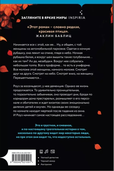 Роуз за восемьдесят, у нее деменция. Однако ее жизнь продолжается. То удивительно проницательная, то поразительно забывчивая, она проводит дни, бродя по коридорам дома престарелых, размышляет о его персонале и обитателях и ждет визитов своих эмоционально далеких детей и внучек. Но однажды ее соседку по комнате находят мертвой после падения из окна. И Роуз начинает самое настоящее расследование…
