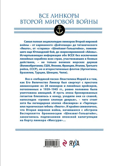 Самая полная энциклопедия линкоров Второй мировой войны – от карманного "Дойчланда" до титанического "Ямато", от "старика" "Шлейзвиг-Гольштейна", помнившего еще Ютландский бой, до сверхсовременной "Айовы". Исчерпывающая информация обо ВСЕХ без исключения линейных кораблях всех стран, участвовавших в боевых действиях, – не только великих морских держав (Великобритании, США, Японии, Франции, Италии, Третьего Рейха, СССР), но и второстепенных флотов (Аргентины, Бразилии, Турции, Швеции, Чили).
