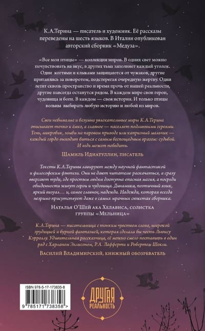 «Все мои птицы» — коллекция миров. В одних свет можно почувствовать на вкус, в других тьма заполняет каждый уголок. Одни когтями и клыками защищаются от чужаков, другие притаились за поворотом, подстерегая очередную жертву. Одни летят сквозь пространство и время прочь от нашей реальности, другие навсегда останутся рядом. В каждом мире свои герои, чудовища и боги. В каждом — своя история. И только птицы вольны выбирать любую историю и любой из миров.