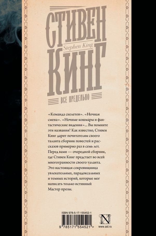 «Команда скелетов». «Ночная смена». «Ночные кошмары и фантастические видения»… Вы помните эти названия? Как известно, Стивен Кинг дарит почитателям своего таланта сборник повестей и рассказов примерно раз в семь лет. Перед вами — очередной сборник, где Стивен Кинг предстает во всей многогранности своего таланта. Это настоящая сокровищница увлекательных, парадоксальных и темных историй, которые мог написать только истинный Мастер прозы.
