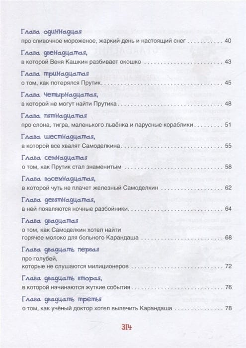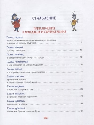 Книга расскажет о приключениях веселых маленьких человечков: художника Карандаша и мастера Самоделкина. Рисунки Карандаша мгновенно оживают, а Самоделкин может смастерить любой, даже самый сложный механизм. В книгу вошли две сказки: «Приключения Карандаша и Самоделкина» и «Волшебная школа Карандаша и Самоделкина».