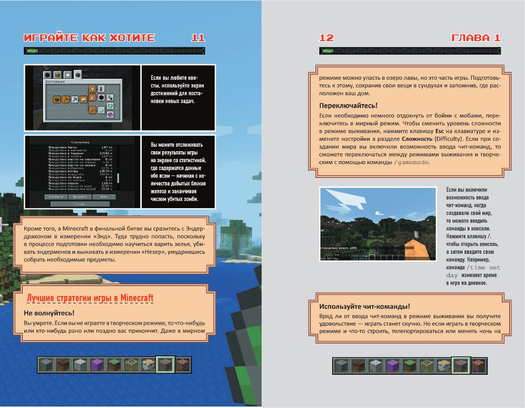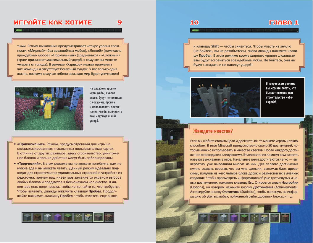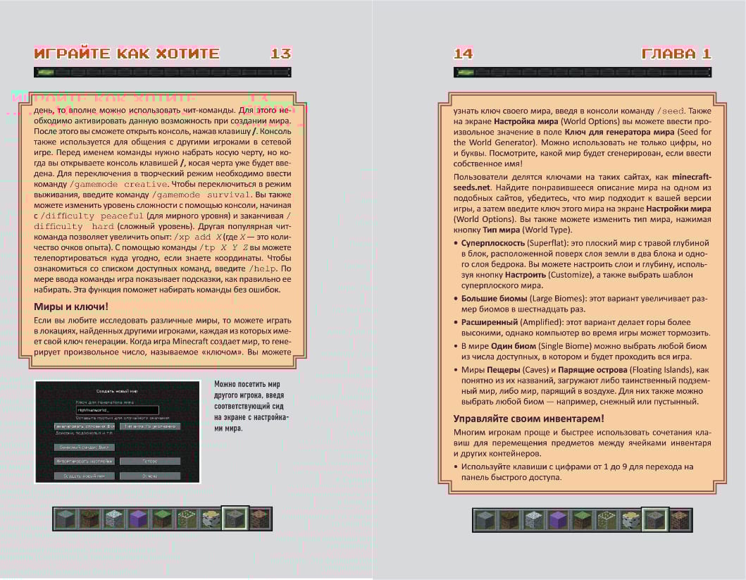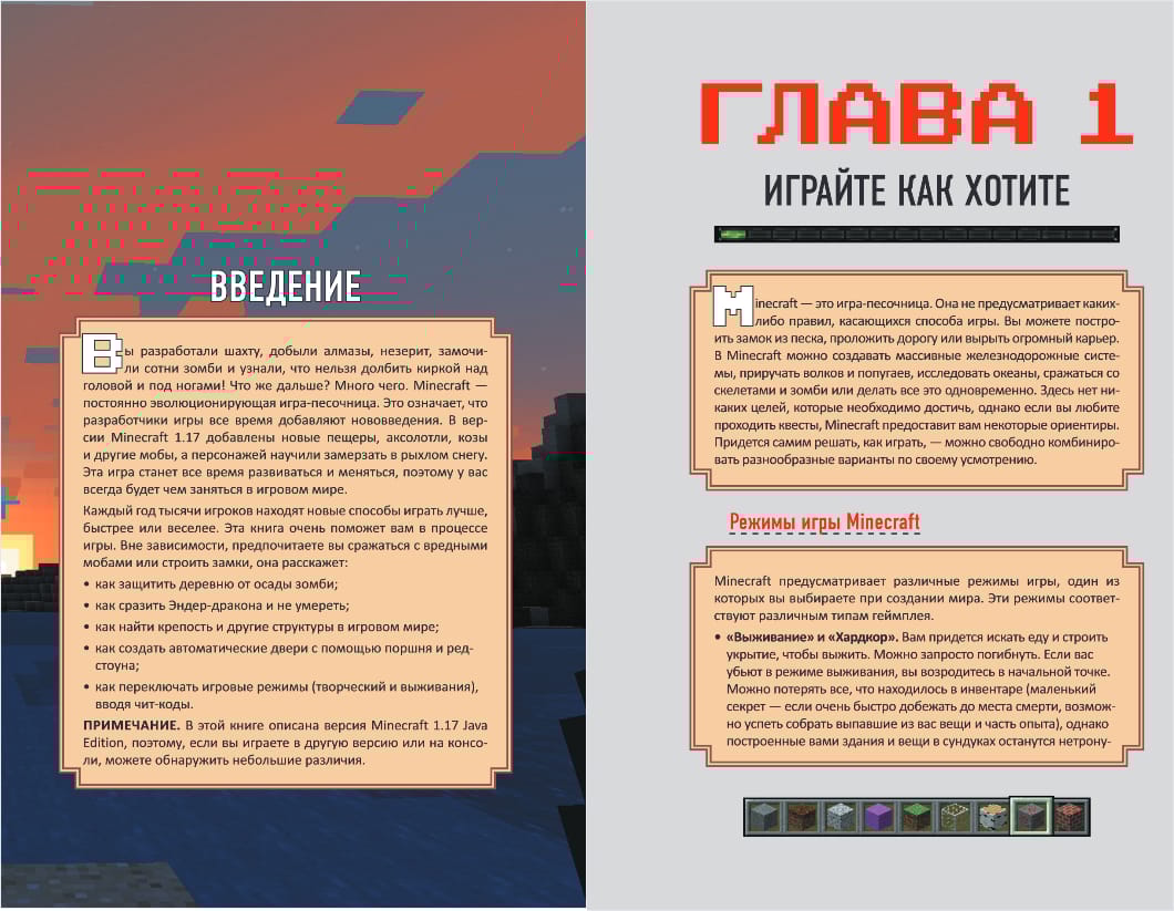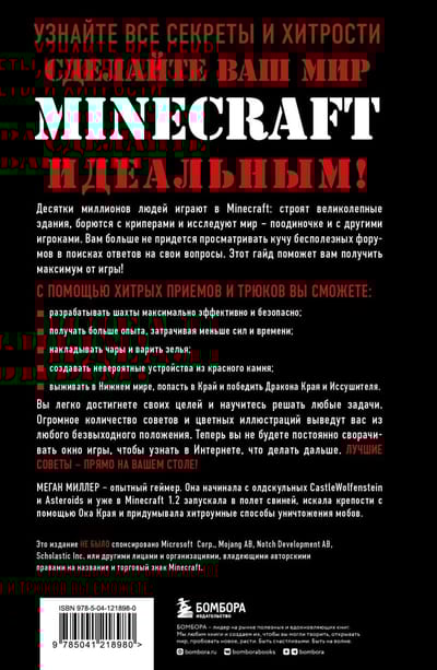 Minecraft - одна из самых популярных игр. Они уникальна и универсальна: вы можете строить удивительные здания, бороться с монстрами, изучать мир вокруг - в одиночку и с друзьями. Если вы хотите добиться максимальных результатов в Minecraft, вам необходимо применять нестандартные решения и использовать эффективные приемы игры. В этом гайде вы их найдёте! Самые полезные хитрости и трюки помогут вам быстро разрабатывать шахты, атаковать враждебных мобов и разводить животных, исследовать мир, и, конечно, вы сможете без страха спуститься в Нижний мир, чтобы уничтожить Дракона Края! Вам больше не придется просматривать множество бесполезных форумов в поисках ответов и прохождений. Этот обновленный гайд станет вашей настольной книгой и раскроет все секреты Minecraft.