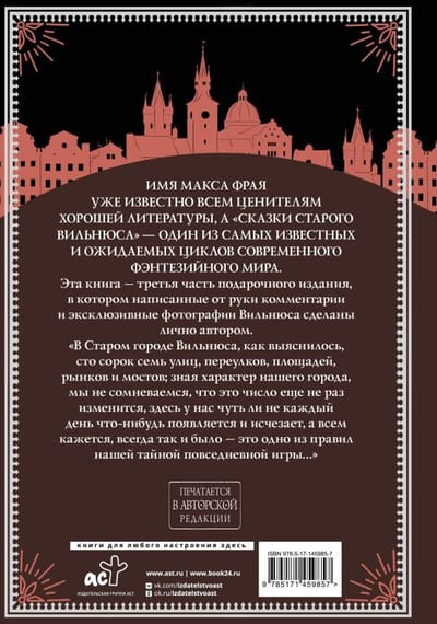 Имя Макса Фрая уже известно всем ценителям хорошей литературы, а «Сказки старого Вильнюса» — один из самых известных и ожидаемых циклов современного фэнтезийного мира. Эта книга — вторая часть подарочного издания, в котором написанные от руки комментарии и эксклюзивные фотографии Вильнюса сделаны лично автором.