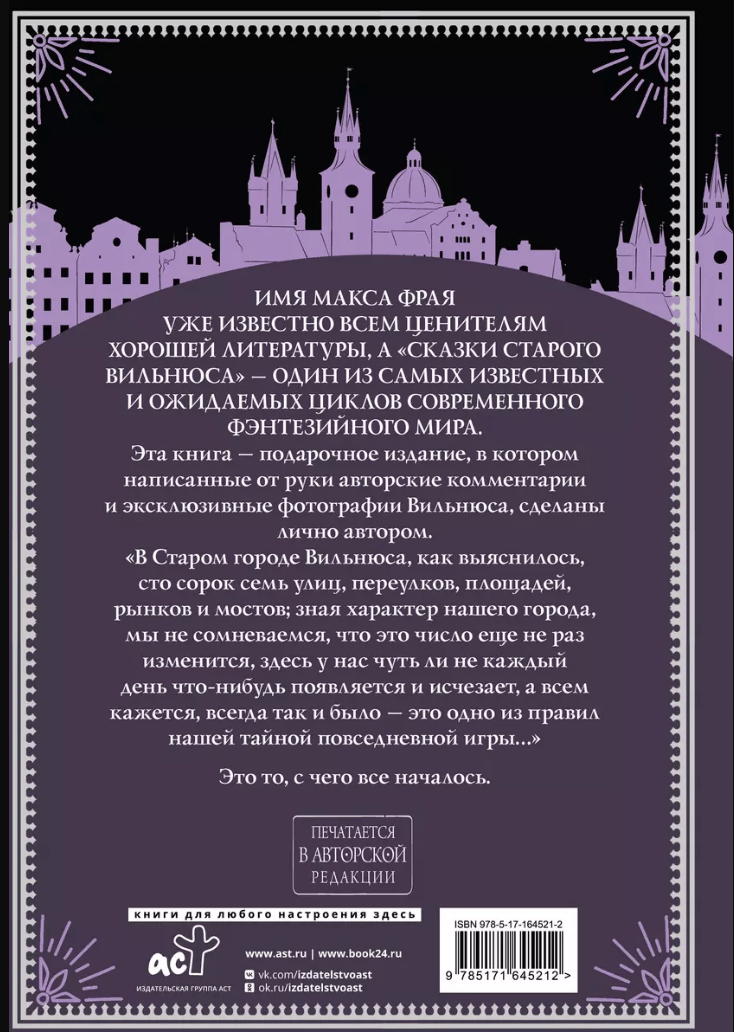 Имя Макса Фрая уже известно всем ценителям хорошей литературы, а «‎Сказки старого Вильнюса»‎ — один из самых известных и ожидаемых циклов современного фэнтезийного мира. Эта книга — первая часть подарочного издания, в котором написанные от руки комментарии и эксклюзивные фотографии Вильнюса сделаны лично автором.