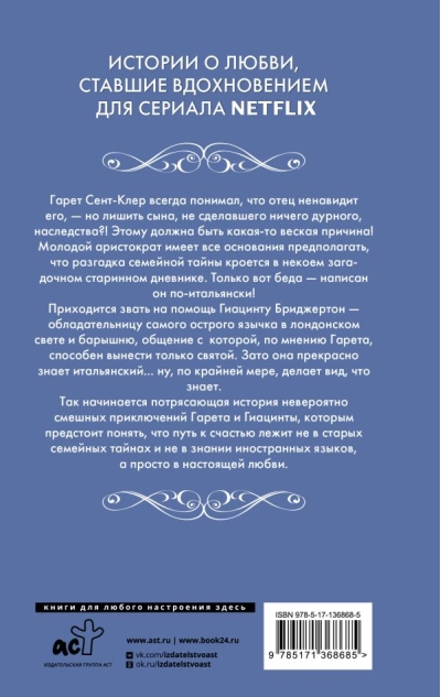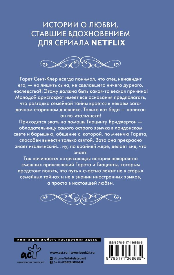 Гарет Сент-Клер всегда понимал, что отец ненавидит его, — но лишить сына, не сделавшего ничего дурного, наследства?! Этому должна быть какая-то веская причина! Молодой аристократ имеет все основания предполагать, что разгадка семейной тайны кроется в некоем загадочном старинном дневнике. Только вот беда — написан он по-итальянски! Приходится звать на помощь Гиацинту Бриджертон — обладательницу самого острого язычка в лондонском свете и барышню, общение с которой, по мнению Гарета, способен вынести только святой. Зато она прекрасно знает итальянский… ну, по крайней мере, делает вид, что знает. Так начинается потрясающая история невероятно смешных приключений Гарета и Гиацинты, которым предстоит понять, что путь к счастью лежит не в старых семейных тайнах и не в знании иностранных языков, а просто в настоящей любви.