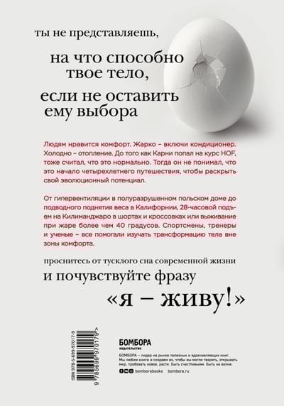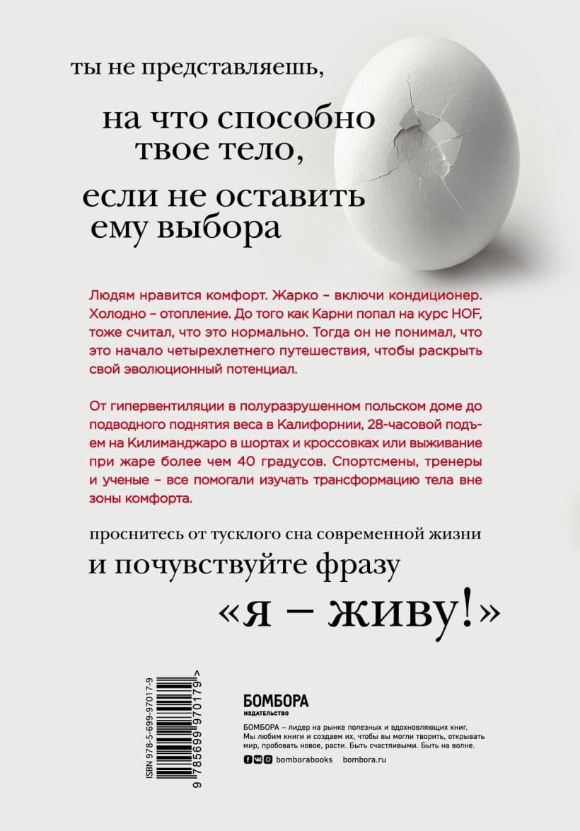 Правда? Не совсем. Что нас не убивает, может сделать нас сильнее, выносливее, увеличить продолжительность жизни и выявить истинные возможности нашего мозга. Как? Журналист и антрополог Скотт Карни после долгих лет, проведенных в офисном кресле, задался этим вопросом. Как человек может обмануть эволюцию и открыть в себе навыки, которыми обладали наши предки? Выживать в диком холоде, не питаться несколько дней и свободно выходить из зоны комфорта? В ходе работы Карни помогал рекордсмен Вим Хоф, способный контролировать температуру тела, и другие люди-феномены, вылечившиеся от аутоимунных заболеваний, похудевшие и избавившиеся от диабета. Перед вами амбициозное журналистское исследование, посвященное определению истинной связи между разумом и телом. Людям нравится комфорт. Жарко - включи кондиционер. Холодно - отопление. До того как Скотт Карни попал на курс HOF, тоже считал, что это нормально. Тогда он не понимал, что это начало четырехлетнего путешествия, чтобы раскрыть свой эволюционный потенциал. От гипервентиляции в полуразрушенном польском доме до поднятия веса под водой в Калифорнии, 28-часовой подъем на Килиманджаро в шортах и кроссовках или выживание при жаре в более чем 40 градусов. Спортсмены, тренеры и ученые - все помогали Карни изучать трансформацию тела вне зоны комфорта.