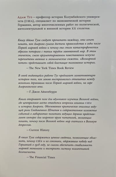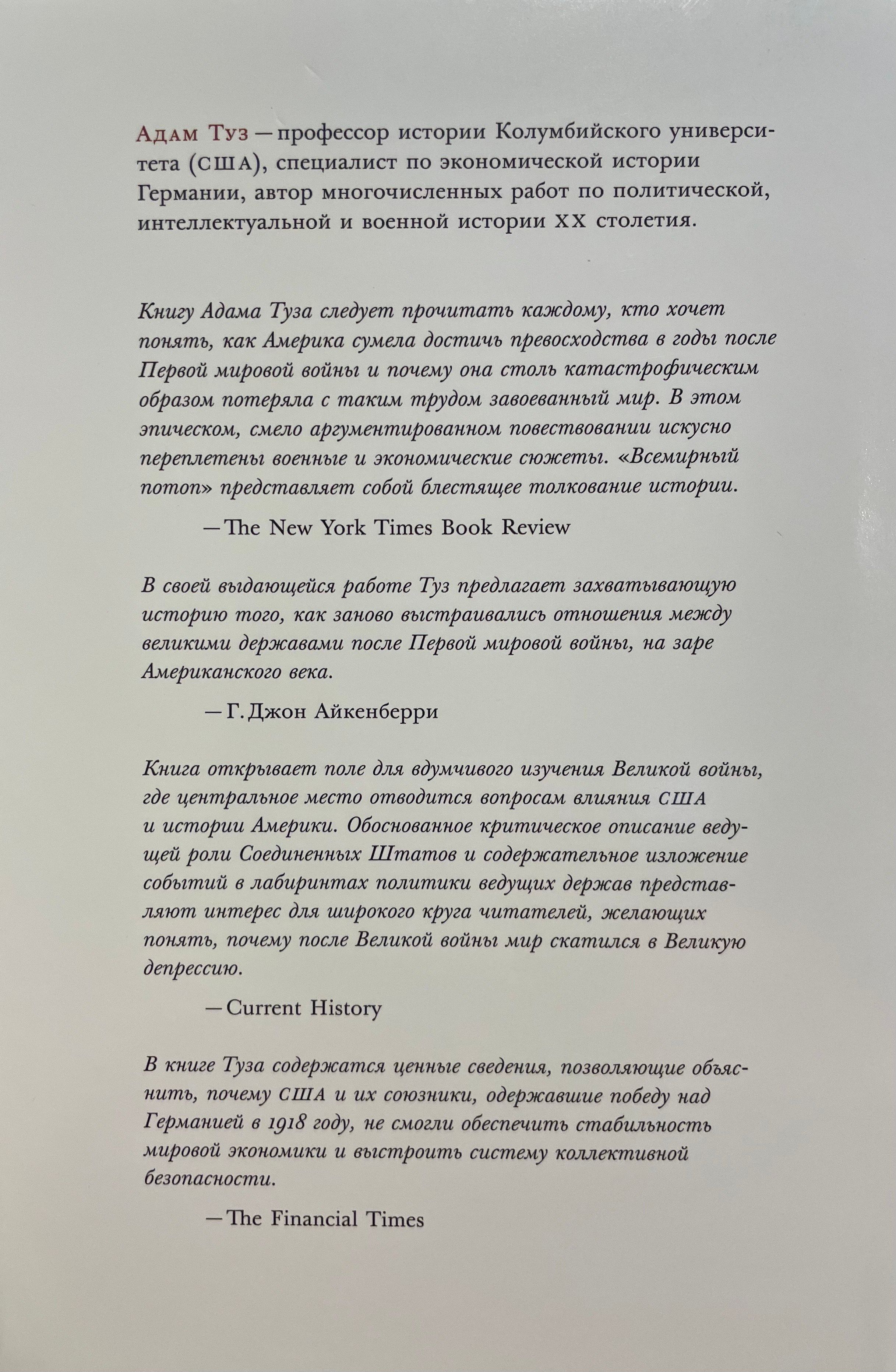 Спустя сто лет после начала Первой мировой войны йельский историк Адам Туз предлагает совершенно новый взгляд на нее, сосредоточивая внимание на заключительных годах конфликта и последствиях вплоть до Великой депрессии. В этот неспокойный период надежды на долгий мир и либеральный интернационализм столкнулись с насильственными потрясениями и возникновением тоталитарных режимов. Тогда же произошло рождение нового мирового порядка, в котором все крупные державы, как победившие, так и проигравшие в войне, вынуждены были связать свою судьбу с Соединенными Штатами, ведущей экономической силой мира.