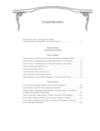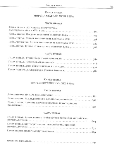 Первая книга под названием «Открытие Земли» охватывает период с VI века до нашей эры до конца XVII века. Читатель найдет здесь информацию о путешественниках Древней Греции и Рима, Средневековья и Эпохи великих географических открытий. Особенно подробно автор повествует о путешествиях Марко Поло, Христофора Колумба, Васко да Гамы, Америго Веспуччи, Фернана Магеллана и других первооткрывателей. Вторая книга — «Мореплаватели XVIII века» — это история путешествий Кука, Лаперуза, Палласа, Беринга, Гумбольдта и других. В третьей книге «Путешественники XIX века» описаны экспедиции Крузенштерна, Коцебу, Литке, Дюмон-Дюрвиля, Беллинсгаузена, Врангеля и других замечательных первооткрывателей. Современное издание сопровождается также дополнительным справочным материалом.