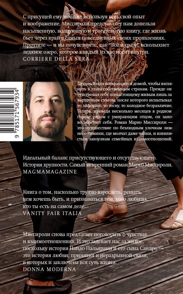 Нандо успел поработать электронщиком, железнодорожником, барменом, но его настоящей страстью всегда были танцы. Они с женой Катериной принимали участие во всех танцевальных марафонах на Ривьере — разумеется, желая победить. Семейная страсть к победам передалась и Сандро, только его стихия — карты. Когда-то у него была работа, подруга, будущее. Их вытеснил карточный стол, где Сандро надеется, рискнув, выиграть всё и сразу, испытывая то эйфорию, то тоску, то холодное безразличие. И теперь блудный сын возвращается домой, чтобы взглянуть в глаза собственным страхам. Роман Марко Миссироли — это путешествие по безлюдным улочкам зимнего Римини, где молчат даже чайки, и извилистым закоулкам семейных взаимоотношений.
