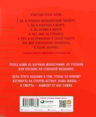 Судебно-медицинский эксперт Алексей Решетун (более известный как жж-блогер mossudmed) знаком со смертью не понаслышке. Он имеет с ней дело каждый рабочий день вот уже 17 лет: собственно, ее причины и есть объект его изучения. А значит, ему лучше, чем кому бы то ни было, известно, почему мы умираем и что не надо делать, чтобы не попасть до времени на секционный стол. Читатели его блога стремительно бросают курить, выпивать и начинают заниматься спортом.