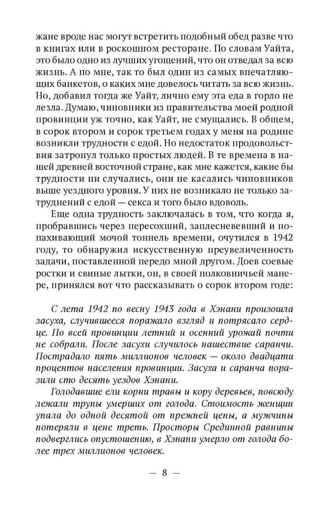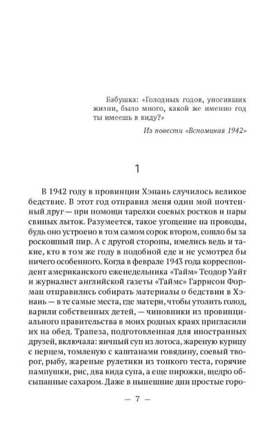 Заглавная повесть сборника «Вспоминая 1942» рассказывает о гибели от голода трех миллионов земляков Лю Чжэньюня в годы войны с Японией и является манифестом гражданской позиции автора обнажая глубинные основания его отношения к миру и жизни. Поклонники литературного стиля Лю Чжэньюня откроют для себя писателя с новой стороны.