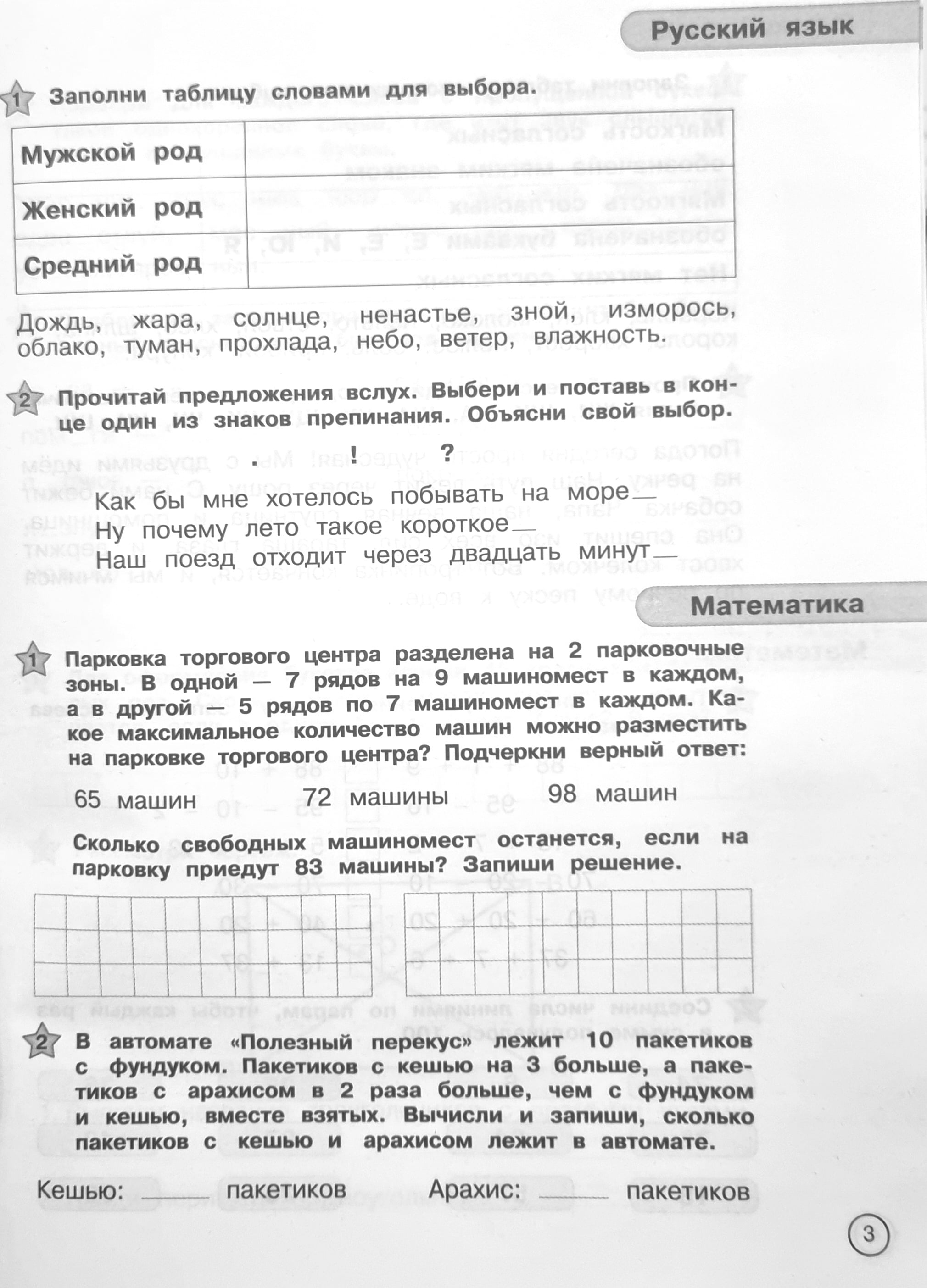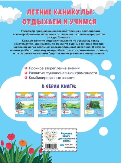 Тренажёр для учеников начальной школы предназначен для повторения и закрепления всего пройденного материала за курс 2 класса. Пособие состоит из 30 комбинированных занятий, каждое из которых включает в себя два задания по русскому языку и два задания по математике. Выполняя в день по одному занятию в течение 10—15 минут, школьник в течение месяца вспомнит и отработает все пройденные темы по важнейшим школьным предметам. Прикладной характер заданий будет поддерживать интерес ребёнка к их выполнению.