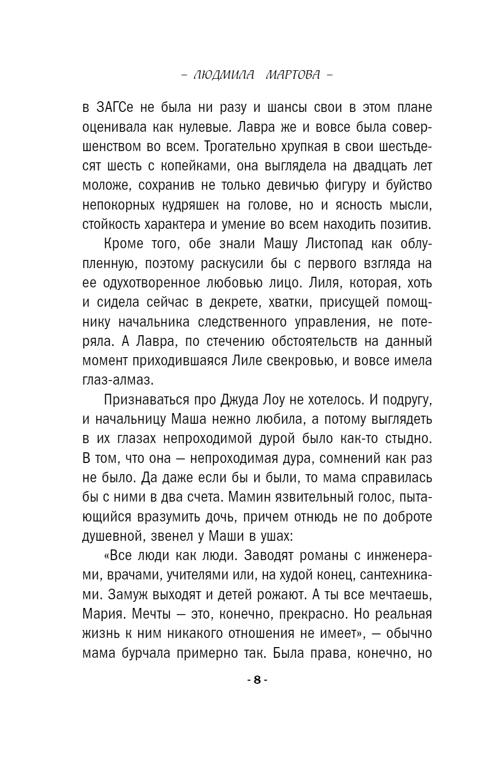 Людмила Мартова — мастер увлекательной детективной мелодрамы, автор захватывающих остросюжетных историй. Их отличают закрученная детективная интрига, лихой финал с неожиданной развязкой и, конечно же, яркая любовная линия. Героини романов Людмилы Мартовой — современные молодые женщины, которые точно знают, чего хотят от жизни.