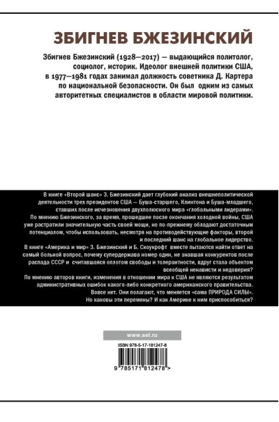 В книге «Америка и мир» З. Бжезинский и Б. Скоукрофт вместе пытаются найти ответ на самый больной вопрос, почему супердержава номер один, не знавшая конкурентов после распада СССР и считавшаяся оплотом свободы и толерантности, вдруг стала объектом всеобщей ненависти и недоверия? По мнению авторов книги, изменения в отношении мира к США не являются результатом административных ошибок какого-либо конкретного американского правительства. Вовсе нет. Они полагают, что меняется «сама природа силы». Но каковы эти перемены? И как Америке к ним приспособиться?