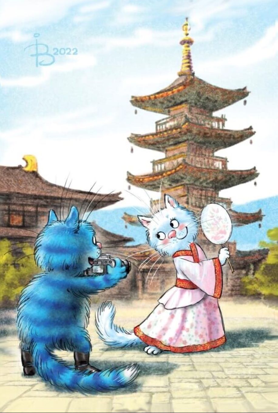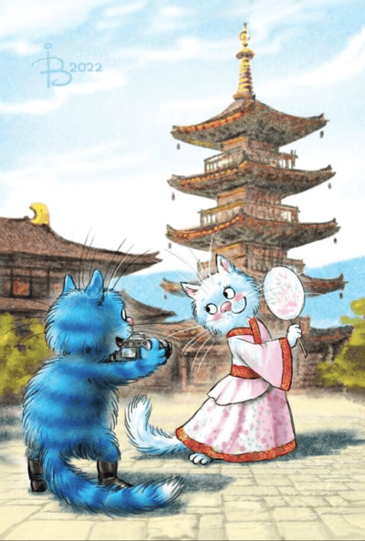 Красивая и забавная почтовая открытка с синими котами обязательно понравится получателю, поскольку рисунки Ирины Зенюк очень милые и продуманы до мелочей.