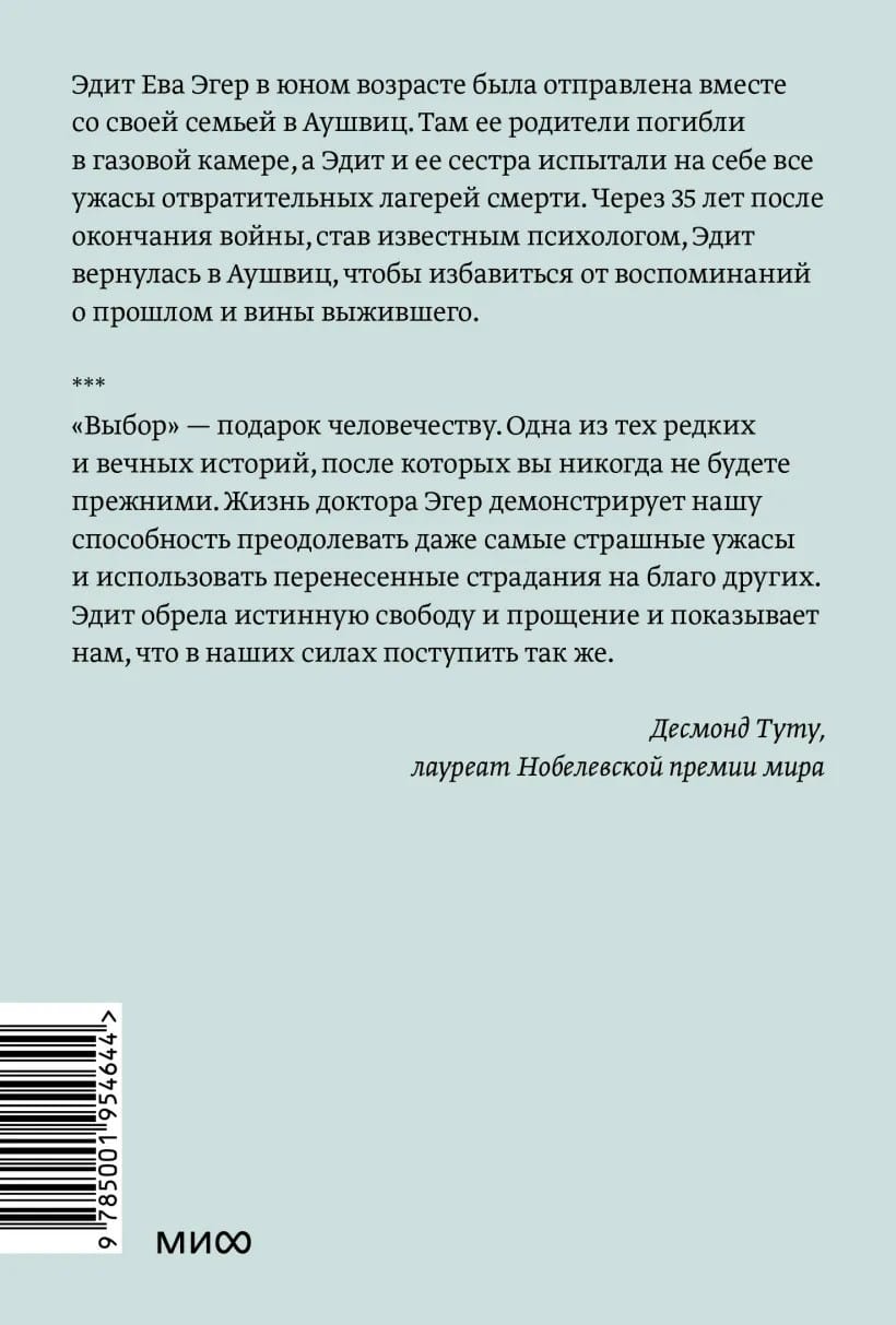 Одна из самых сильных книг о войне и внутренней силе человека. В 1944 году шестнадцатилетняя балерина Эдит Эгер была отправлена вместе со своей семьей в Аушвиц. Спустя всего несколько часов после гибели ее родителей нацистский доктор Йозеф Менгеле заставил Эдит танцевать ради собственной забавы и ее выживания. Эдит и ее сестра пережили все ужасы Аушвица, Маутхаузена и Гунскирхена — лагерей смерти. 4 мая 1945 года Эдит, едва живую, достали из кучи трупов. Пытки, голод и постоянная угроза смерти не сломили Эдит, а ее внутренний мир помог обрести жизнеутверждающую силу и душевную свободу. Через 35 лет после окончания войны, став известным психологом, Эдит вернулась в Аушвиц, чтобы избавиться от воспоминаний о прошлом и вины выжившего. Эдит чередует события своего личного путешествия с трогательными историями тех, кому сама помогла излечиться. Эта книга — незабываемая история выживания и исцеления, история освобождения и силы человеческого духа. Она показывает, что мы всегда можем выбирать, чему нас учит жизнь и как относиться к происходящему. Это книга, которая изменит жизнь и подарит поколениям читателей поддержку.