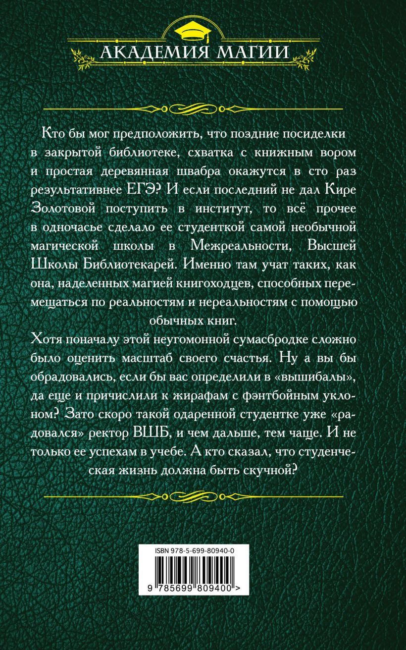 Кто бы мог предположить, что поздние посиделки в закрытой библиотеке, схватка с книжным вором и простая деревянная швабра окажутся в сто раз результативнее ЕГЭ? И если последний не дал Кире Золотовой поступить в институт, то всё прочее в одночасье сделало ее студенткой самой необычной магической школы в Межреальности, Высшей Школы Библиотекарей. Именно там учат таких, как она, наделенных магией книгоходцев, способных перемещаться по реальностям и нереальностям с помощью обычных книг.