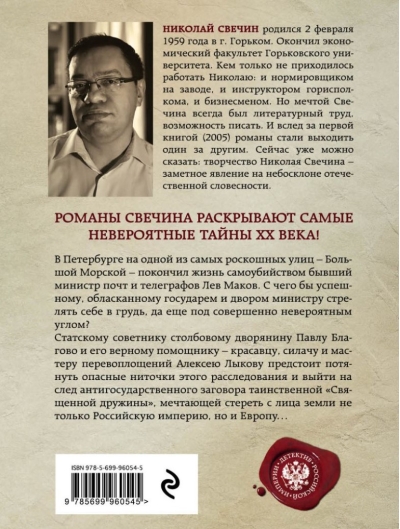 Статскому советнику столбовому дворянину Павлу Благово и его верному помощнику — красавцу, силачу и мастеру перевоплощений — Алексею Лыкову предстоит потянуть опасные ниточки этого расследования и выйти на след антигосударственного заговора таинственной «Священной дружины», мечтающей стереть с лица земли не только Российскую империю, но и Европу…