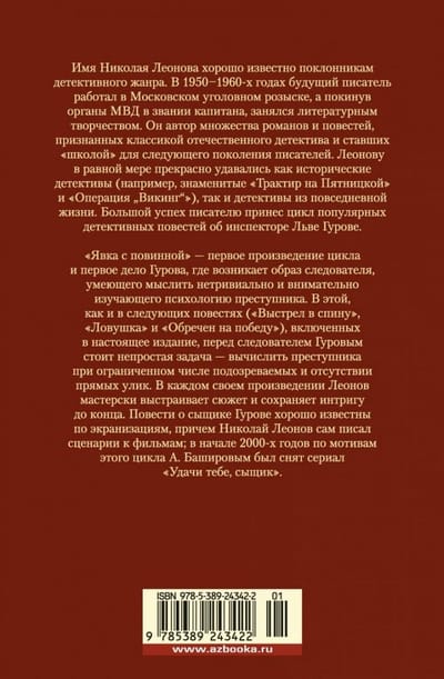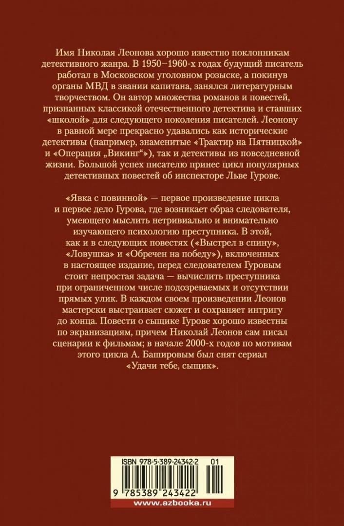 Имя Николая Леонова хорошо известно поклонникам детективного жанра. В 1950–1960-х годах будущий писатель работал в Московском уголовном розыске, а покинув органы МВД в звании капитана, занялся литературным творчеством. Он автор множества романов и повестей, признанных классикой отечественного детектива и ставших «школой» для следующего поколения писателей. Леонову в равной мере прекрасно удавались как исторические детективы (например, знаменитые «Трактир на Пятницкой» и «Операция «Викинг»), так и детективы из повседневной жизни. Большой успех писателю принес цикл популярных детективных повестей об инспекторе Льве Гурове. «Явка с повинной» — первое произведение цикла и первое дело Гурова, где возникает образ следователя, умеющего мыcлить нетривиально и внимательно изучающего психологию преступника. В этой, как и в следующих повестях («Выстрел в спину», «Ловушка» и «Обречен на победу»), включенных в настоящее издание, перед следователем Гуровым стоит непростая задача — вычислить преступника при ограниченном числе подозреваемых и отсутствии прямых улик. В каждом своем произведении Леонов мастерcки выстраивает сюжет и сохраняет интригу до конца. Повести о сыщике Гурове хорошо известны по экранизациям, причем Николай Леонов сам писал сценарии к фильмам; в начале 2000-х годов по мотивам этого цикла А. Башировым был снят сериал «Удачи тебе, сыщик».